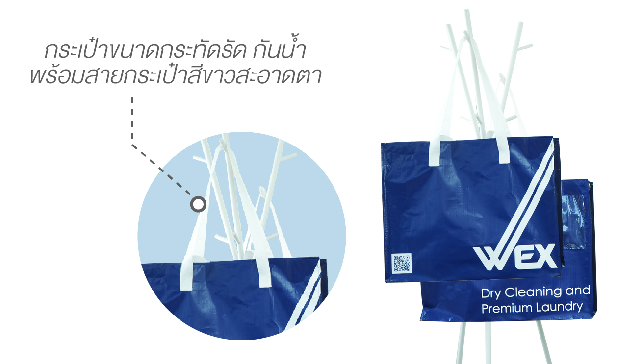 ถุงใส่ผ้าซักของ WEX เป็นถุงที่ถูกดีไซน์มาเป็นพิเศษสำหรับบริการซักอบรีดแบบพรีเมี่ยมของ WEX Premium Laundry อีกทั้งยังมีความแข็งแรงทนทาน และสามารถกันน้ำได้ เพื่อเป็นการปกป้องเสื้อผ้าของท่าน
